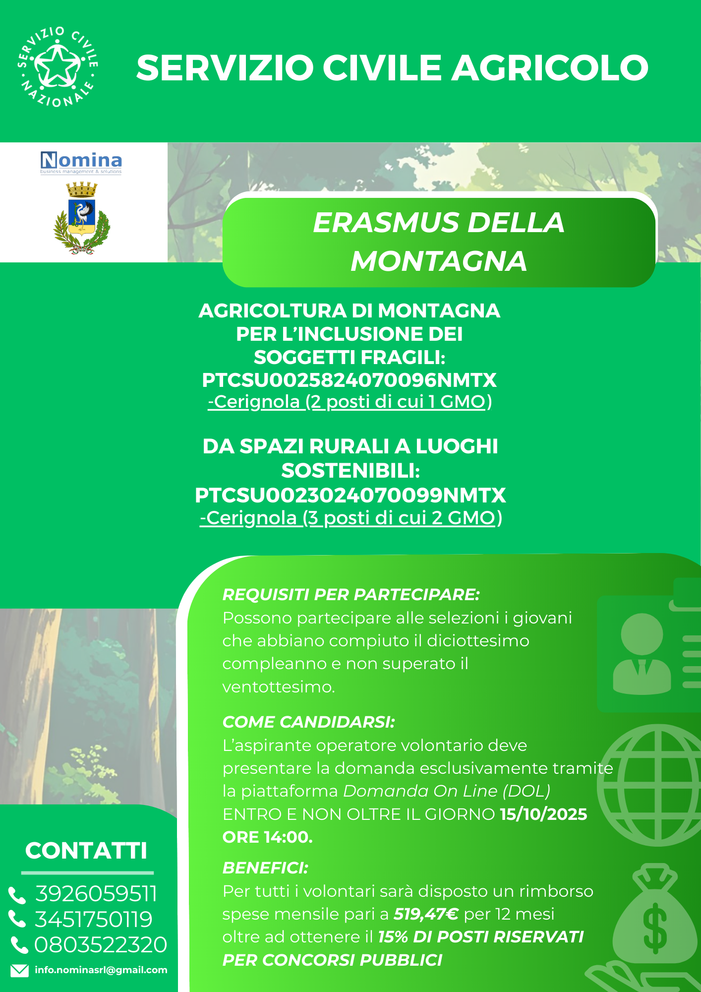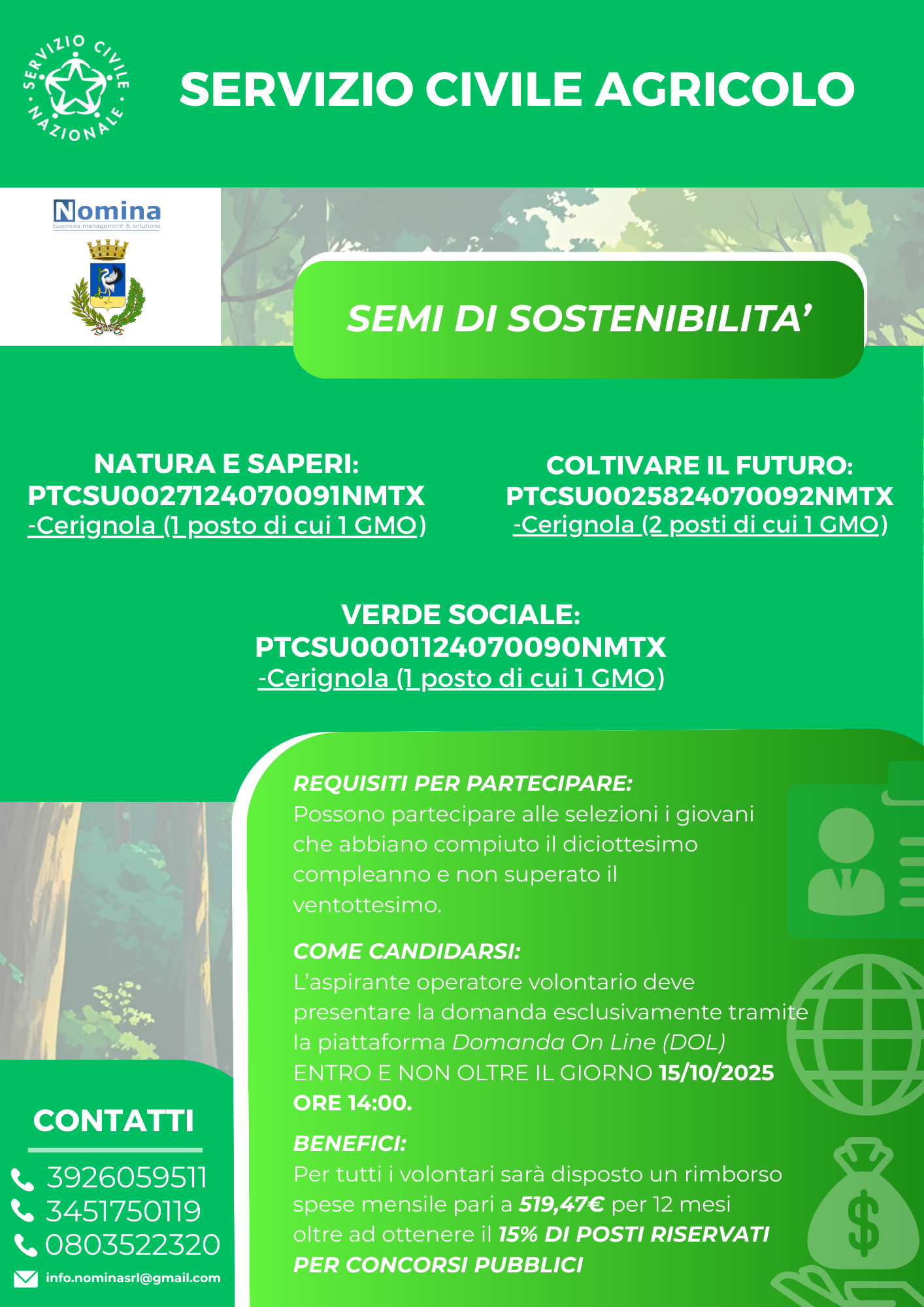 Aperte le iscrizioni per partecipare ai progetti di Servizio Civile Universale denominati “COLTIVARE IL FUTURO” – Programma di intervento “SEMI DI SOSTENIBILITÀ: AGRICOLTURA PER IL BENE COMUNE” e “AGRICOLTURA DI MONTAGNA PER L’INCLUSIONE DEI SOGGETTI FRAGILI” – Programma di intervento “SCAG – AGRICOLTURA 2025 ERASMUS DELLA MONTAGNA”.